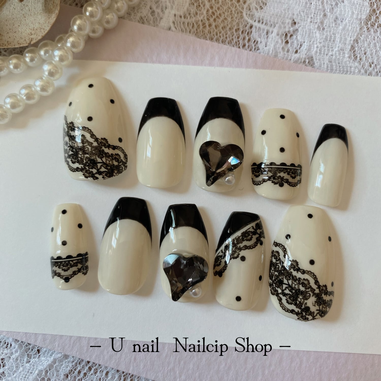 オフホワイト 黒レース ガーリーネイル